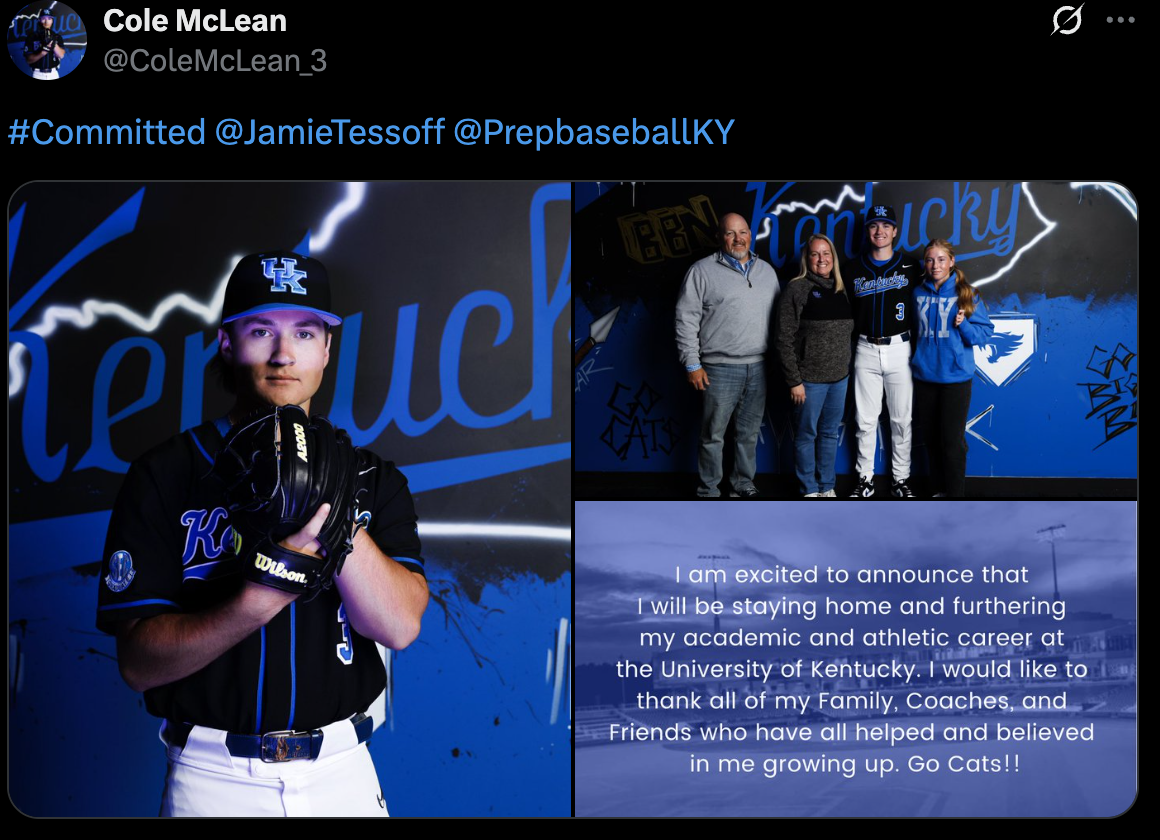 Cole McLean, the 2025 Gatorade Player of the Year in Kentucky, committed to the Wildcats on Monday. McLean had been committed to Tennessee since 2022, but opened his recruitment following Tony Vitello's departure to the San Francisco Giants earlier in the week.
